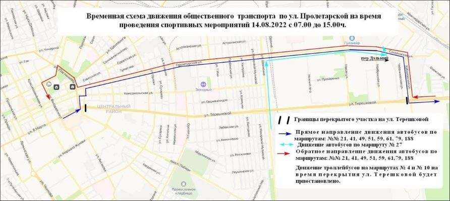 Движение общественного транспорта на время проведения велоспортивного фестиваля будет организовано в объезд - по улице Пролетарской. Автобусы маршрутов №21, 41, 49, 51, 59, 61, 79 и 188 при движении в сторону центра города будут поворачивать с улицы Терешковой на улицу Хабаровскую, а затем уходить на Пролетарскую. В обратном направлении - из центра - автобусы с улицы 8 Марта будут следовать по улицам Постникова, Комсомольской, Корецкой, а затем поворачивать на Пролетарскую. Автобусы маршрута №27 будут ездить по своему обычному маршруту: с улицы Шевченко поворачивать на улицу Пролетарскую и двигаться по ней без заезда на улицу Терешковой.