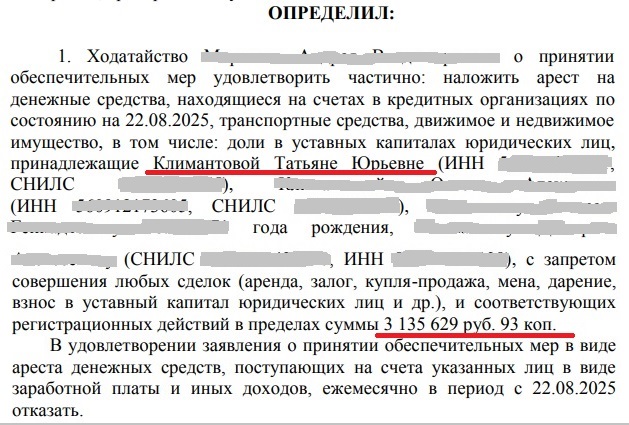 Как явствует из определения от 22 августа 2025 года по делу № А47-21747/2024, опубликованному на официальном сайте Арбитражного суда Оренбургской области, арест наложен на «доли в уставных капиталах юридических лиц, принадлежащие Климантовой Татьяне Юрьевне», в пределах суммы 3 135 629 рублей 93 копейки: