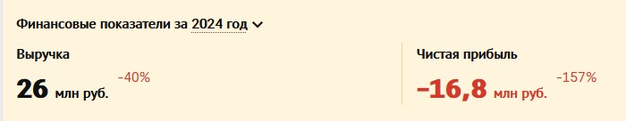 Согласно открытым данным, выручка предприятия за 2024 года составила 26 млн. рублей, а чистая прибыль ушла в минус (-16,8 млн. рублей).