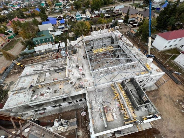 Уже к середине октября в планах закончить кладку наружных стен второго этажа, чердака, строительство теплотрассы, подведения отопления подвала. Число рабочих, задействованных на объекте, составляет более ста человек.