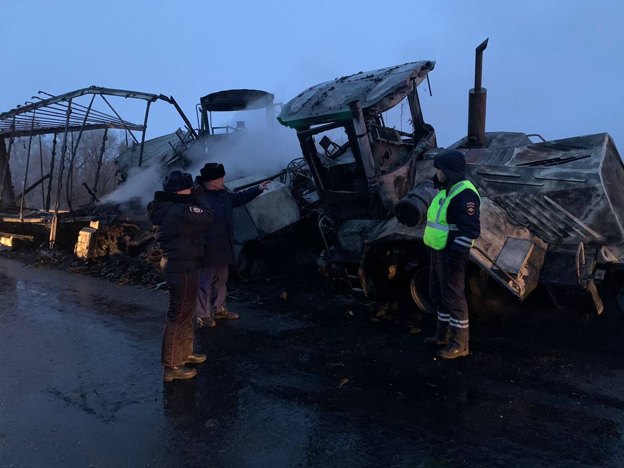 В условиях плохой видимости (туман) на двухполосной трассе фура «Мерседес Бенц» врезалась в тягач «Вольво», который перевозил два бульдозера. После столкновения все транспортные средства вспыхнули, очевидцы сообщают, что пламя достигало 6-7 метров в высоту. Сотрудники МЧС смогли потушить пожар лишь ближе к рассвету.