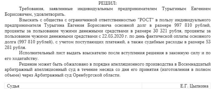Предприниматель, устав ждать, сначала направил претензию с требованием оплатить задолженность и проценты за пользование чужими деньгами, а потом пошел в Арбитражный суд региона. Ответчик в суд не явился и не представил доказательств оплаты взыскиваемой суммы. Суд постановил взыскать с него сумму основного долга в размере 997 810 рублей, проценты за пользование чужими деньгами, а также судебные расходы в сумме 53 000 рублей.