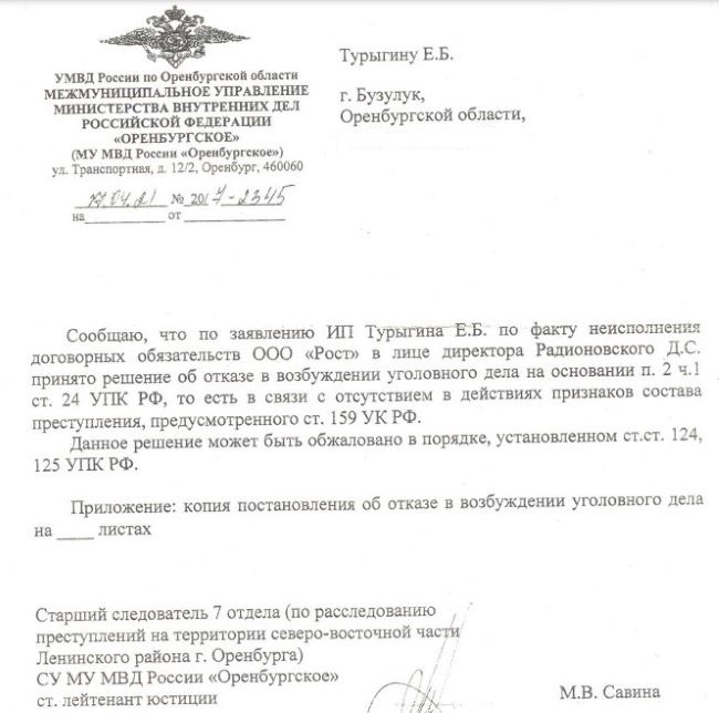 Предприниматель был вынужден обратиться с заявлением в УМВД по Оренбургской области, ходил на прием к бывшему начальнику регионального УМВД Алексею Кампфу со своей проблемой. Заявление было направлено для проверки сперва в городской отдел полиции, а позднее в отдел полиции № 7. Оперативное сопровождение проверки осуществлялось оперативниками УБЭП. Тем не менее, в возбуждении уголовного дела было отказано. Правоохранители не усмотрели в происходящем признаков состава преступления по статье «Мошенничество».