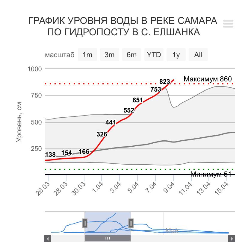 За прошедшие сутки уровень воды в реке Самара у Бузулукского бора вырос на 72 сантиметра. Тем самым на гидрологическом посту была достигнута отметка абсолютного максимума за историю наблюдений - 895 см. Это на 115 см выше критического уровня. Ранее абсолютный максимум - 860 см - наблюдался 18 апреля 2011.