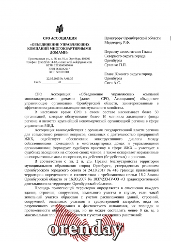 СРО Ассоциация «Объединение управляющих компаний многоквартирными домами» под управлением генерального директора Дмитрия Жукова в адрес прокурора Оренбургской области Руслана Медведева, первого заместителя Главы Северного округа Оренбурга Павла Сухенко и главы Южного округа Александра Сисы подготовила обращение, в котором привела правовые обоснования того, что идея перекладывания ответственности по уборке территорий на собственников зданий на практике не только не жизнеспособна, но и противоречит федеральному законодательству.