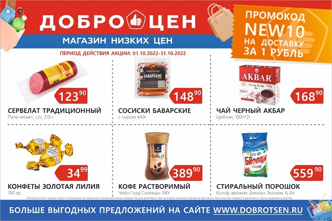* Акция действует на покупку в интернет-магазине Доброцен. Промокод предоставляет снижение цены на оплату услуг доставки до одного рубля. Срок действия промокода с 1 по 31 октября 2022 года. Промокод действует на один заказ.