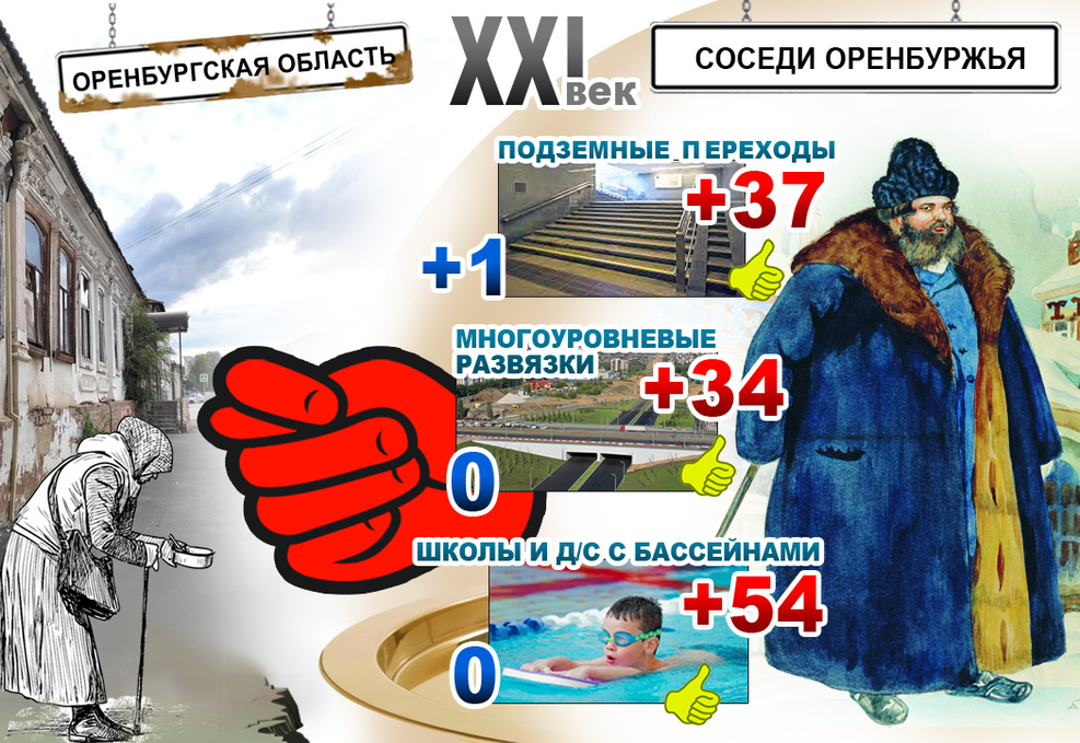 Сопоставляя показатели соседних регионов, мы не столько сравниваем абсолютные цифры, сколько соотносим динамику изменений и вектор развития. К примеру, в XX веке и там, и там строили детские сады и школы с бассейнами, а в новом столетии в Оренбурге вдруг перестали, скатившись до уровня проблем классной комнаты с одним окном и очереди в единственный школьный туалет. На образном уровне это можно выразить при помощи пышного букета, где один цветок-регион по какой-то причине вдруг стал увядать и загибаться.