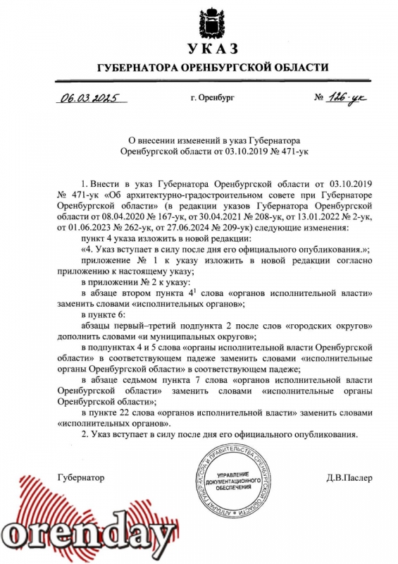 Изменения в Указ губернатора Оренбургской области от 03.10.2019 года № 471-ук «Об архитектурно-градостроительном совете при Губернаторе Оренбургской области» внесены 6 марта 2025 года.