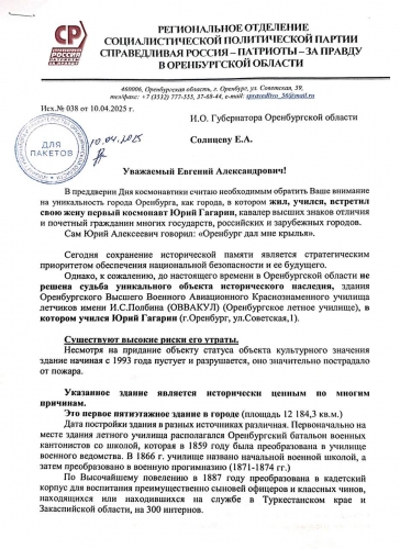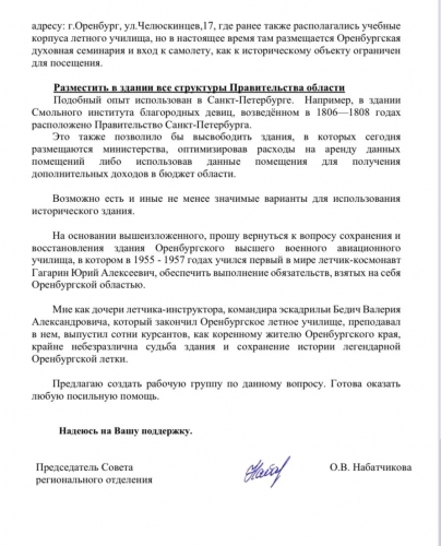Оксана Набатчикова направила обращение в адрес врио губернатора Оренбуржья по вопросу восстановления здания, в котором учился Юрий Алексеевич Гагарин