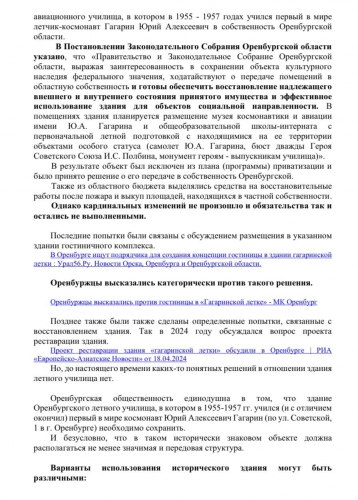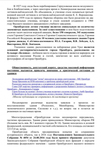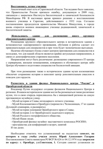 В Постановлении Законодательного Собрания № 4054 от 24.08.2016 года четко сказано, что «Правительство и Законодательное Собрание Оренбургской области, выражая заинтересованность в сохранении объекта культурного наследия федерального значения, ходатайствуют о передаче помещений в областную собственность и готовы обеспечить восстановление надлежащего внешнего и внутреннего состояния принятого имущества и эффективное использование здания для объектов социальной направленности. В помещениях здания планируется размещение музея космонавтики и авиации имени Ю.А. Гагарина и общеобразовательной школы-интерната с первоначальной летной подготовкой с находящимися на ее территории объектами особого статуса (самолет Ю.А. Гагарина, бюст дважды Героя Советского Союза И.С. Полбина, монумент героям - выпускникам училища)».