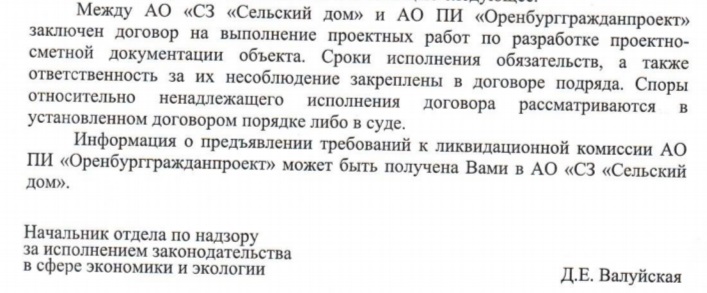 "Сельский дом" направил требование в АО ПИ «ОРЕНБУРГГРАЖДАНПРОЕКТ».