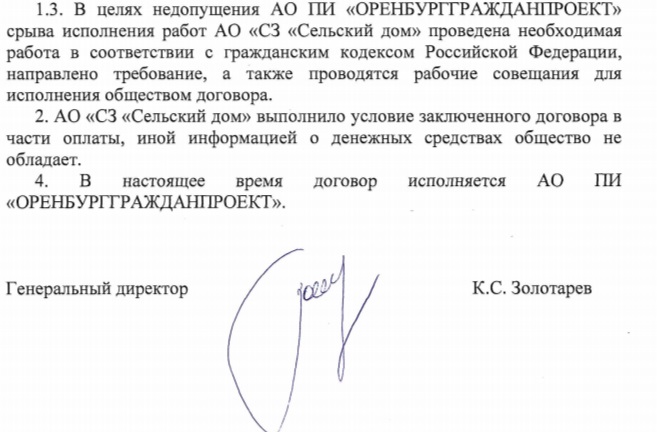 В целях недопущения АО ПИ «ОРЕНБУРГГРАЖДАНПРОЕКТ» срыва исполнения работ АО «СЗ «Сельский дом» проведена необходимая работа в соответствии с ГК РФ, направлено требование, а также проводятся рабочие совещания для исполнения обществом договора. АО «СЗ «Сельский дом» выполнило условие заключенного договора в части оплаты, иной информацией о денежных средствах общество не обладает. В настоящее время договор исполняется АО ПИ «ОРЕНБУРГГРАЖДАНПРОЕКТ», - пояснил Orenday генеральный директор «Сельского дома» Константин Золотарёв.