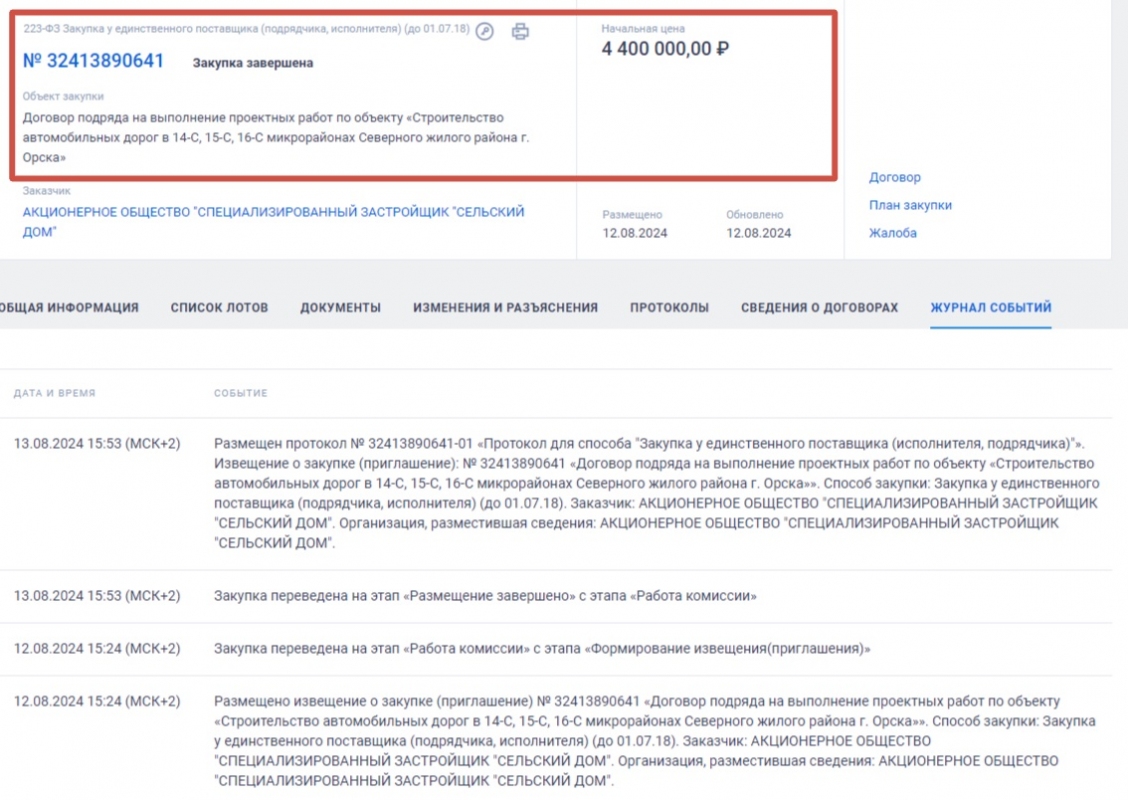 Договор подряда стоимостью 4 400 000,00 р. на выполнение проектных работ по объекту «Строительство автомобильных дорог в 14-С, 15-С, 16-С микрорайонах Северного жилого района г. Орска» был заключен АО «Специализированный застройщик «Сельский Дом» с единственным поставщиком – АО Пи «Оренбурггражданпроект» летом прошлого года. Исполнитель находится в процессе ликвидации.