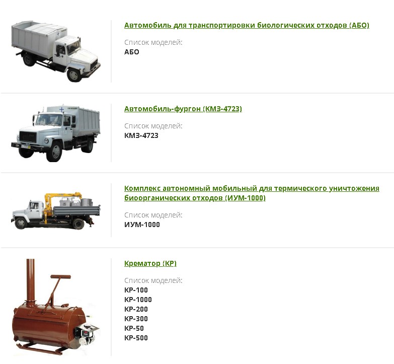В комплект техники и оборудования одного такого входит крематор на одну тонну биоотходов, автомобиль для их сбора и перевозки, холодильная установка для их накопления и сопутствующий инвентарь. Отметим, что каждое наименование оборудование, входящее в комплект, приобретается по отдельному государственному контракту.