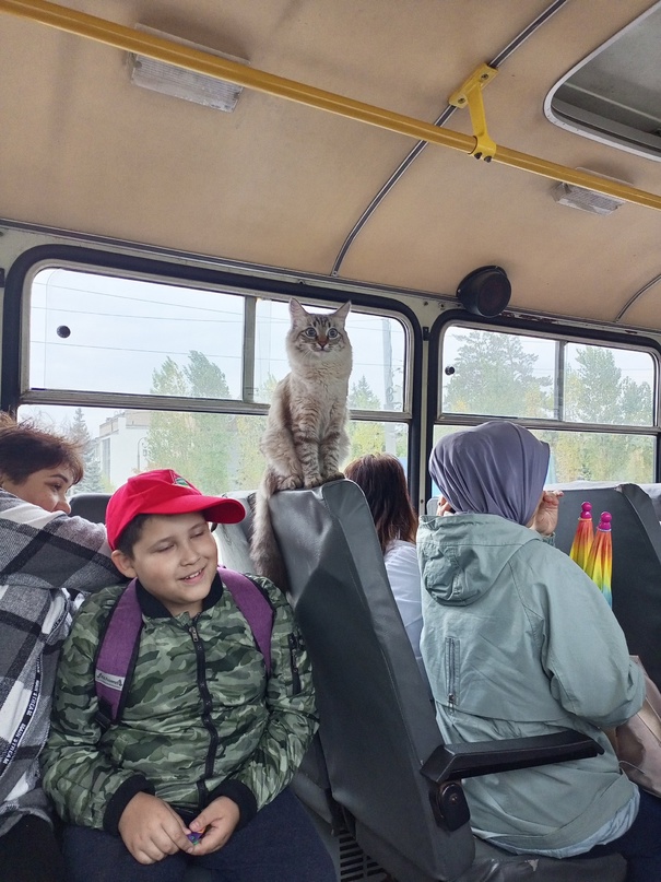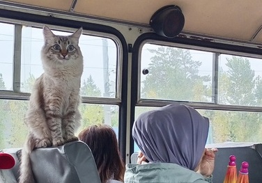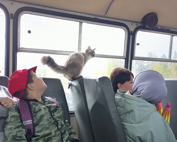 Несколько дней назад в Оренбурге пассажиры маршрутного автобуса №63 ездили вместе с необычным попутчиком. Дело в том, что во время дождя в салон запрыгнула пушистая кошечка.