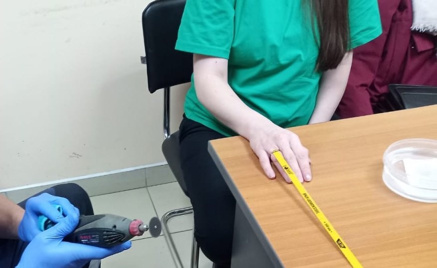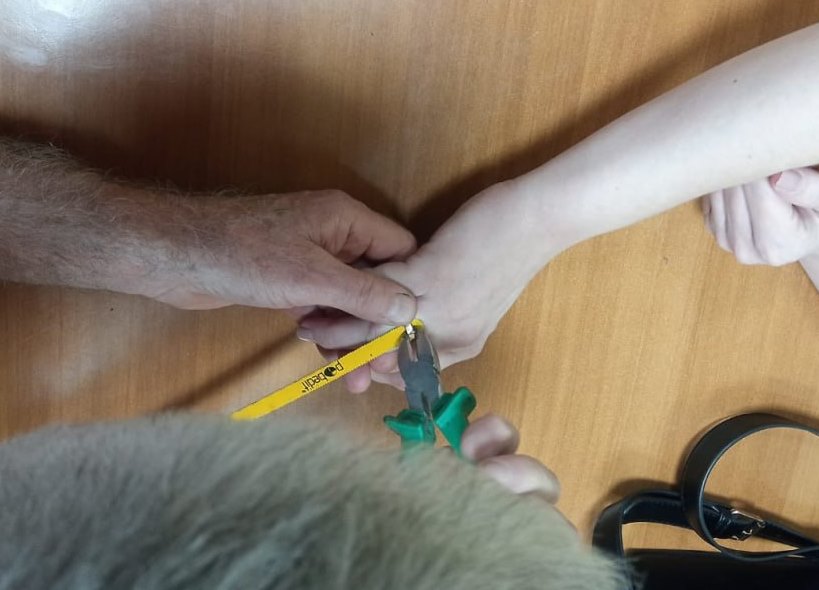 Спасатели департамента ПБ и ГЗ Оренбургской области оказали помощь беременной женщине. Она вместе с мужем приехала ночью на базу аварийно-спасательной службы, чтобы ей помогли снять обручальное кольцо. Из-за характерного в положении женщины отека рук кольцо стало сдавливать палец, принося боль и дискомфорт.