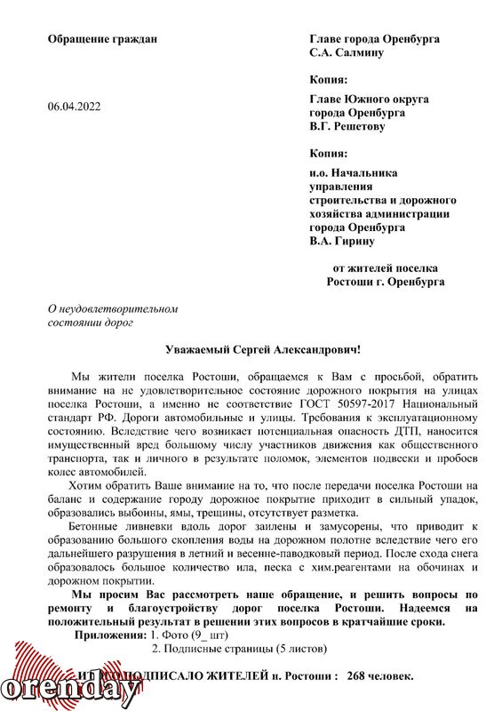 Не дождавшись от властей каких-либо действий по существующим проблемам, жители, которых набралось 268 человек, письменно обратились к Сергею Салмину, главе города, Владимиру Решетову, главе Южного округа и Владимиру Гирину, и.о. начальника управления строительства и дорожного хозяйства администрации города. Они просят заняться уже ремонтом и благоустройством дорог поселка.