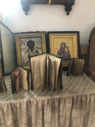 Удалось спасти несколько старинных икон: три большого размера, одну среднего, несколько аналойных, а также около десятка дореволюционных книг. Все иконы конца 19 века. Все они были доставлены на временное хранение в Преображенский храм на горе.