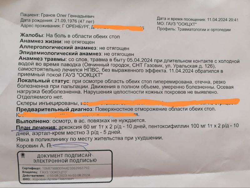 11 апреля супруги все-таки решили обратиться за медпомощью в оренбургскую горбольницу № 1 - в травматологию, где мужчине поставили диагноз - отморожение стоп 1-й степени, но госпитализировать не стали, прописав лежать, расположив ноги повыше,а также мази, антибиотики и противовоспалительные препараты. Сказали, если вдруг посинеют, приезжайте.