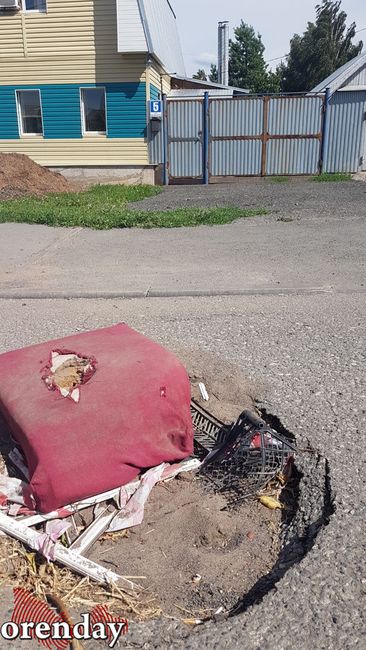 И хорошо бы, если бы эти проблемы оперативно решали, но нет же: всё, чего могут добиться оренбуржцы - «маскировка» опасных участков. Засохшие деревья, автомобильные покрышки, палки, доски, куски пластика, и даже кресло - в ход идёт абсолютно всё. В прошлом году, кстати, ямы маскировали цельным унитазом, почему бы и да.