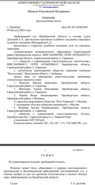 Летом же 2021 года в Арбитражный суд региона поступило исковое заявление от администрации Саракташского района к ООО «Автотехник» о взыскании 4 487 020 рублей, то есть убытков, причиненных вследствие ненадлежащей оценки акций 4 июня 2012 года. Больше года длились судебные разбирательства, в суд в качестве третьего лица вызывали и самого Бахчана Нуреймановича. В итоге, Арбитражный суд Оренбургской области в составе судьи Долговой постановил в исковых требованиях администрации Саракташского района отказать, даже ничего не пояснив в своем решении.