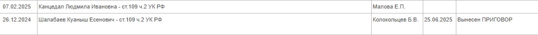 В отношении врачей Канцедал и Шалабаева были возбуждены уголовные дела по статье «Причинение смерти по неосторожности вследствие ненадлежащего исполнения лицом своих профессиональных обязанностей».