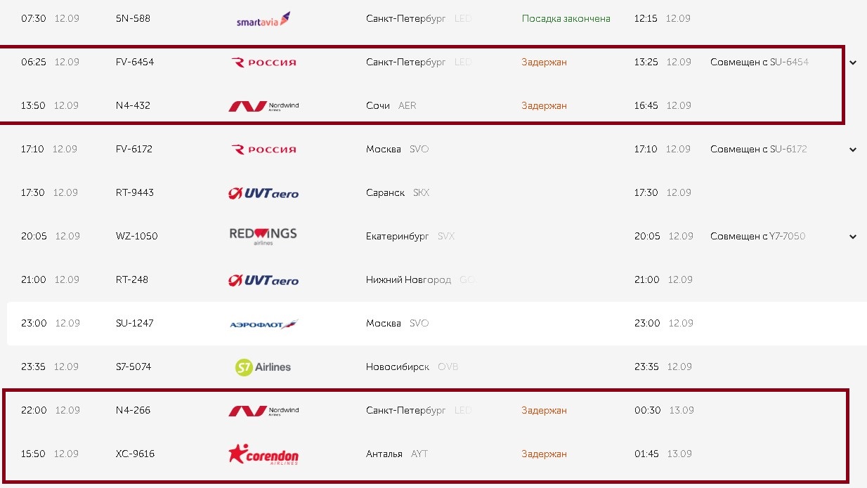 В аэропорту Оренбурга своего вылета ожидают пассажиры двух рейсов из Оренбурга в Санкт-Петербург. Утренний рейс, запланированный на 6:25, передвинут на 13 часов 25 минут. Возможно, совсем скоро эти пассажиры смогут вылететь в северную столицу, зато тем, кому предстоял рейс в 22:00 вылетят уже после полуночи. Задержан и рейс в Сочи. Борт авиакомпании Nordwind Airlines должен был вылететь в 13:50 по местному времени, но теперь рейс отложен на 16:45. Рейс в Турцию, который должен был состояться в 15:50, отложили на 01:45 следующего числа.