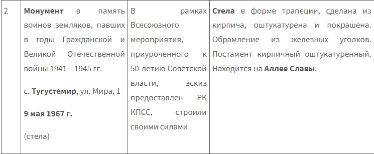 Вместе с некоторыми другими погибшими с нового памятника исчезло упоминание об уроженце Тугустемира лейтенанте Самигулле Музафаровиче Баймурзине,1923 года рождения. Он погиб 20 ноября 1943 года при освобождении Украины, в Запорожской области. Также вычеркнули из списка уроженца Тугустемира старшего сержанта Ахмадуллу Музафаровича Баймурзина, 1925 года рождения. Он погиб 26 января 1945 года при освобождении Польши. На старом памятнике они были, есть они и в книге Памяти села. Больно, что с памятью о моих родных так поступили. Кроме того, в селе убрали стелу с 129 фамилиями погибших в годы Гражданской войны, - сетует уроженец села.