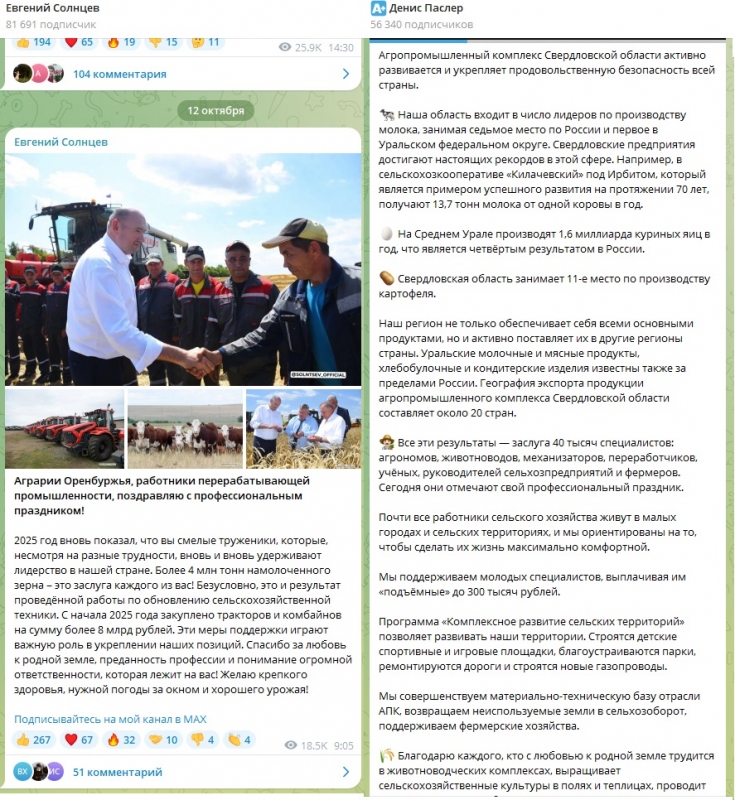 Возможно, именно с этим обстоятельством связано отсутствие на главной странице сайта Правительства Оренбургской области традиционного поздравления аграриев от Губернатора. Тогда как в опубликованном в телеграм-канале праздничном приветствии Евгений Солнцев ограничился одним абзацем с упоминанием всего двух показателей: объема намолоченного зерна – свыше 4 миллионов тонн, и 8 миллиардов рублей, выделенных в этом году на закупку тракторов и комбайнов.