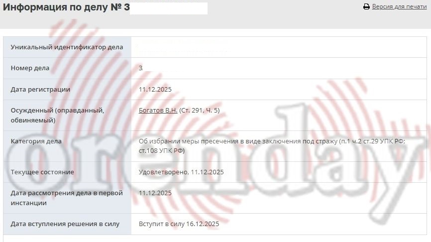 Как выяснил Орендэй, суд удовлетворил ходатайство следствия и в качестве меры пресечения заключил обвиняемого под стражу. Если Богатов не опротестует постановление суда, оно вступит в силу 16 декабря.