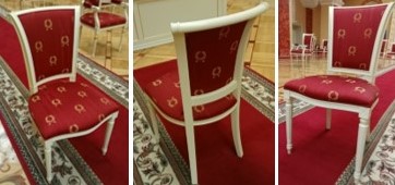 Стулья белые с мягкими сиденьем и спинкой, рубиново-красной тканной обивкой и таким же кантом, а также вышивкой, расположенной в шахматном порядке, в виде венка из листьев золотисто-коричневого цвета с бантом у основания. Сиденье и спинки наполнены полиуретаном, в основании сиденья - фанера.