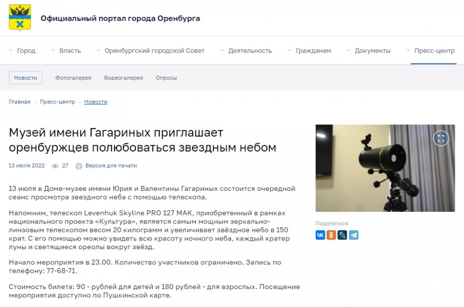 Администрация Оренбурга на официальном сайте и социальных сетях сообщила о том, что 13 июля в Доме-музее имени Юрия и Валентины Гагариных состоится очередной сеанс просмотра звездного неба с помощью телескопа. Это замечательная возможность полюбоваться суперлунием при помощи телескопа Levenhuk Skyline PRO 127 MAK. Его, кстати, приобрели в рамках нацпроекта «Культура». Это самый мощный зеркально-линзовый телескоп, который увеличивает звёздное небо в 150 крат.