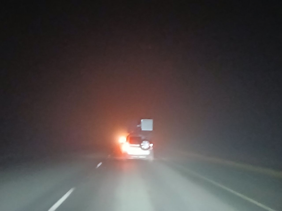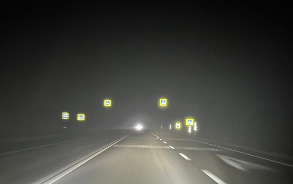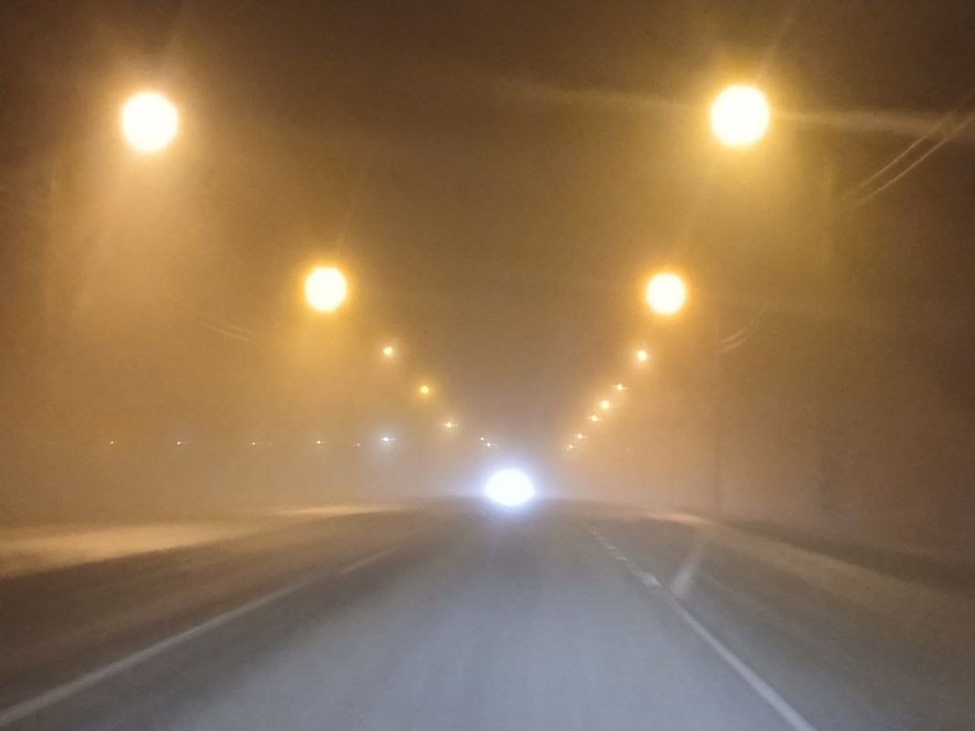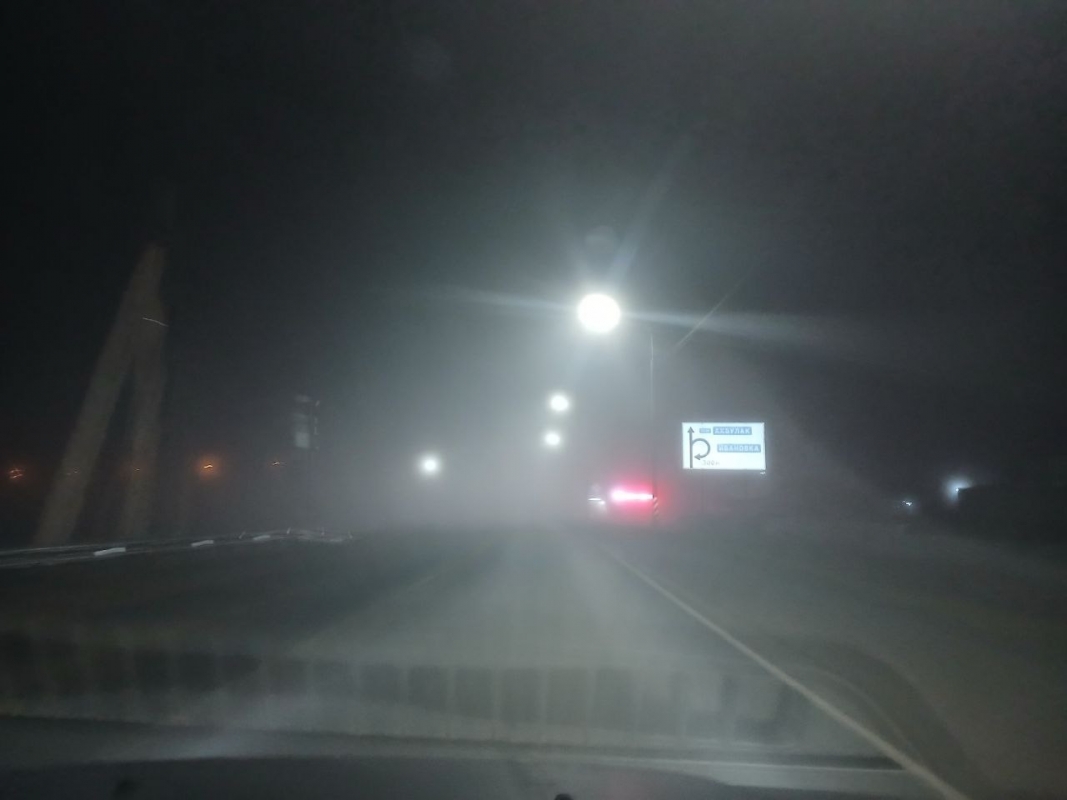 Если в центре города видимость отличная, то на его окраине начинается густой туман, который сохраняется и на трассе.