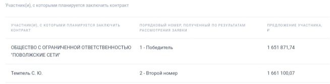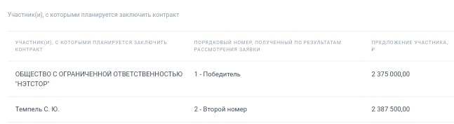 Здесь готовы ждать 30 дней с момента заключения контракта. Поставщик также уже определен: это ООО «Нэтстор». Их предложение – 2 375 000 рублей. На втором месте опять оказался Темпель С.Ю., который был готов поставить машину за 2 387 500 рублей.