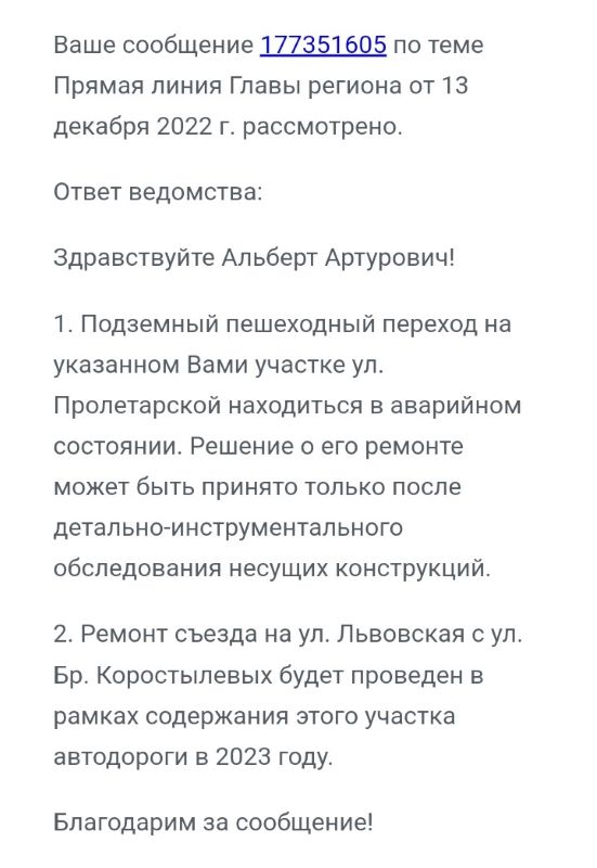 Неравнодушный оренбуржец Альберт в декабре минувшего года задал на "прямой линии" с губернатором снова вопрос о судьбе данного подземного перехода на Пролетарской, на что, спустя время, ему пришел ответ, что "подземка" так и стоит аварийной, решение о ее ремонте может быть принято только после проведения детально-инструментального обследования несущих конструкций, но так и непонятным остался вопрос - проводилось оно или нет.