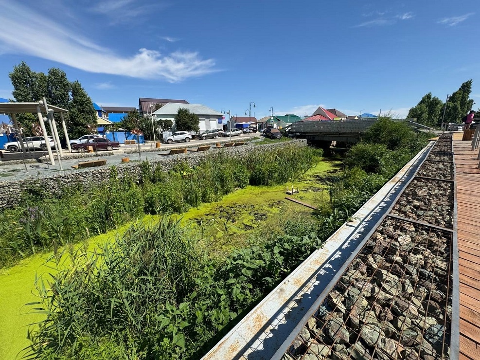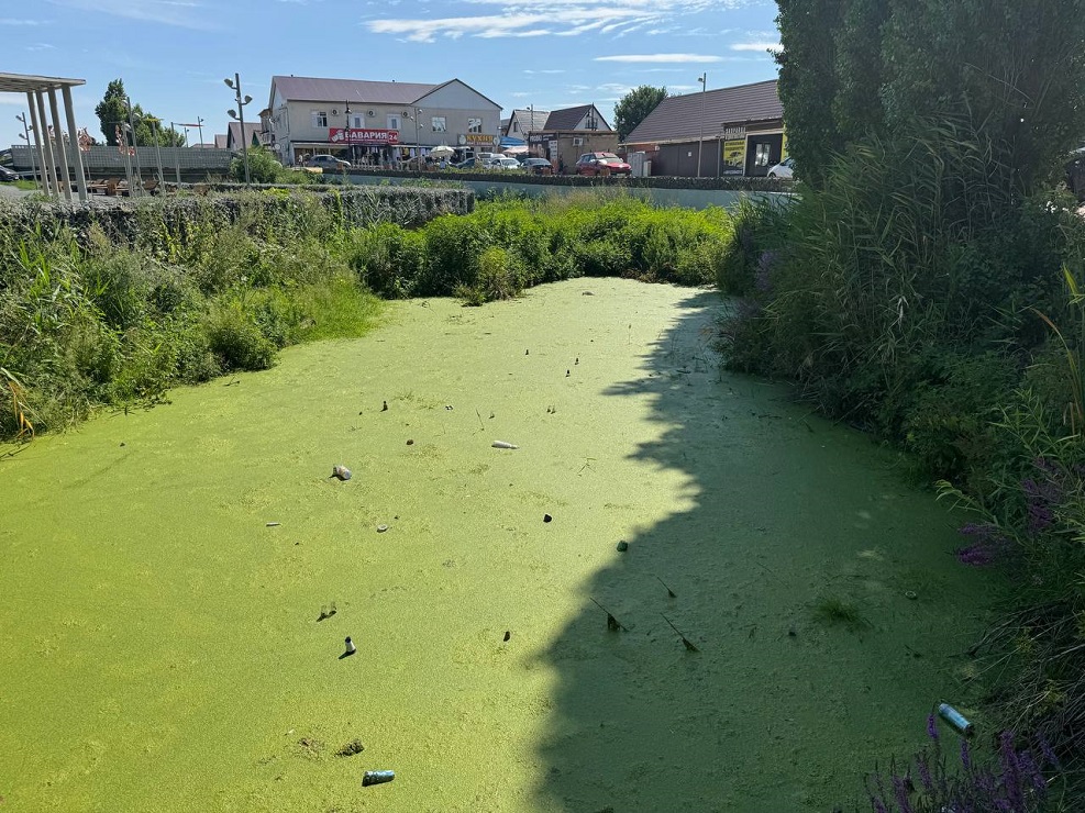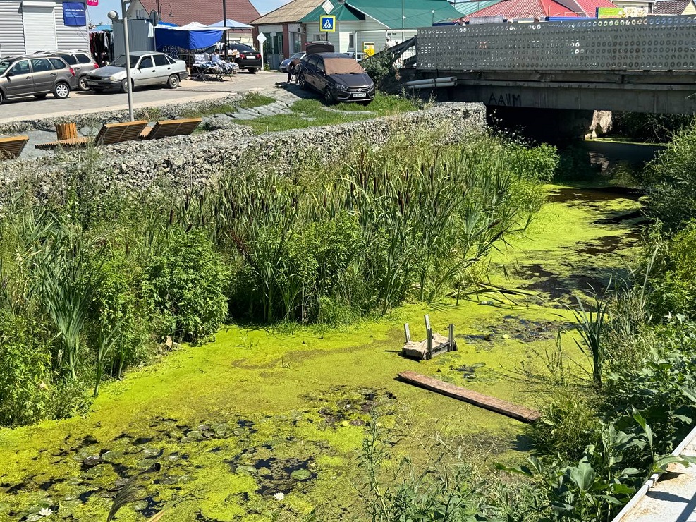 Первое, что бросается в глаза посетителям - вода в реке полностью покрыта тиной и мусором, а по берегам буйно разрослись камыши.