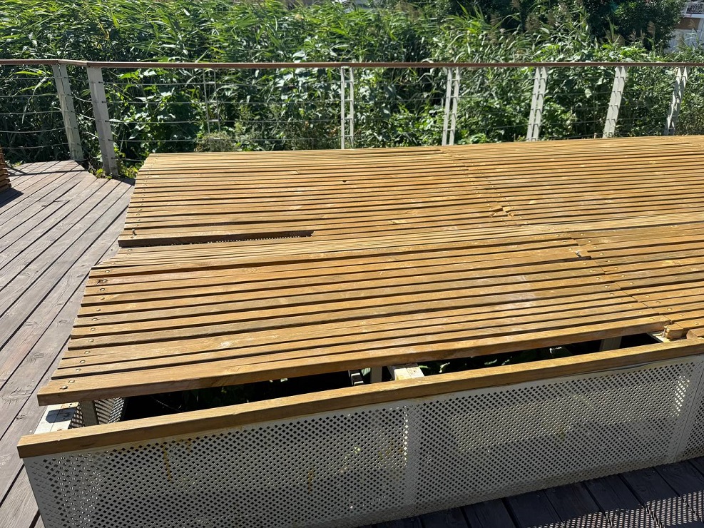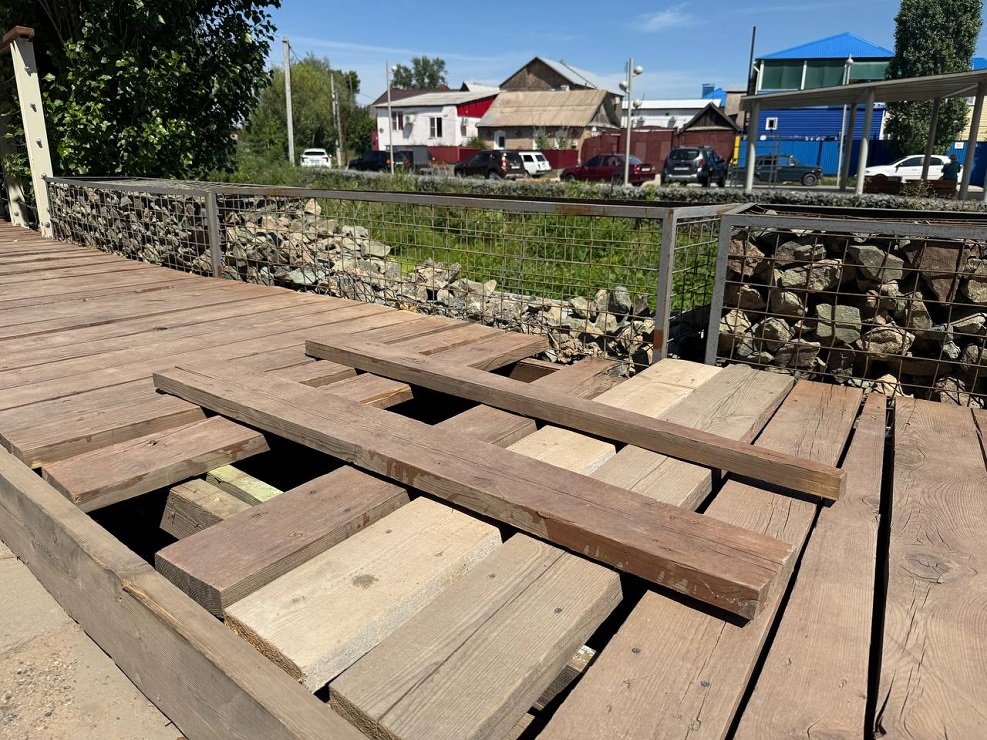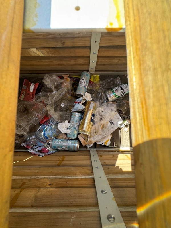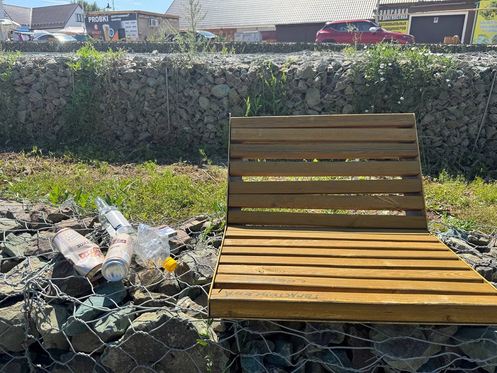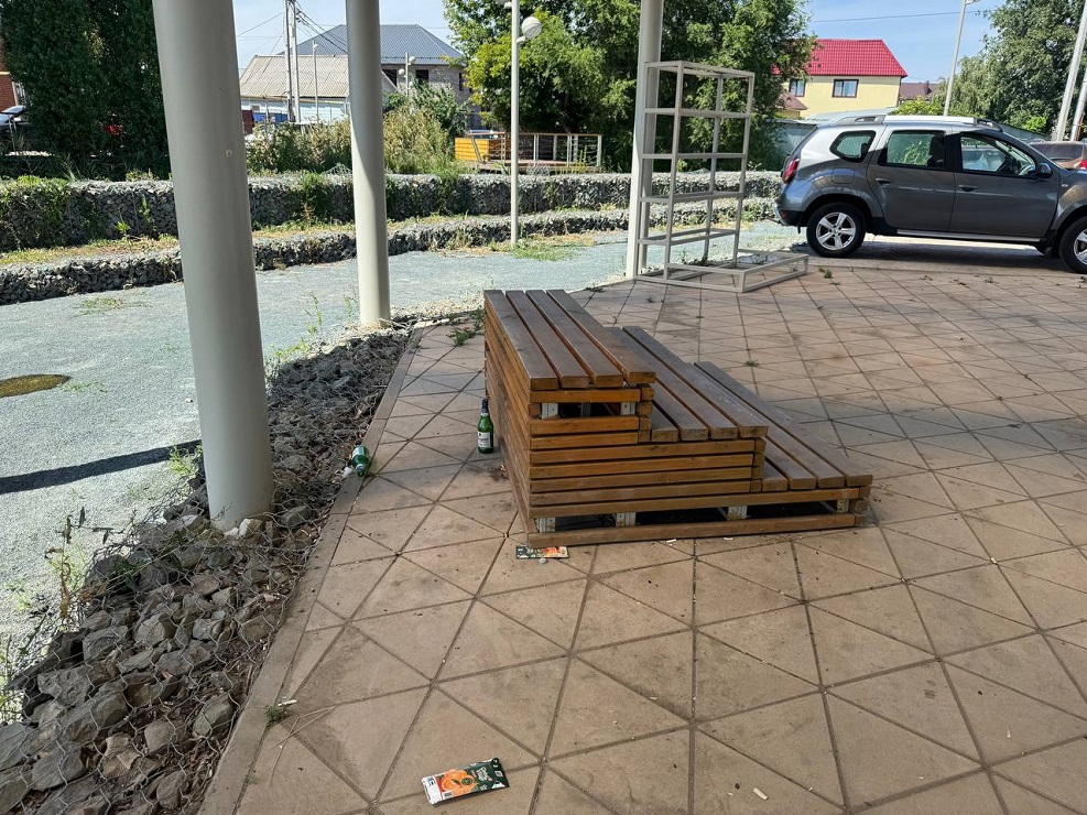 Штакетники с лавочек отпадают, внутри валяются бутылки, пакеты и всё, что ни попало в урну. Лак облез, дерево трескается.