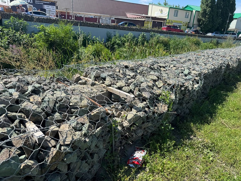 Вдоль реки габионы, представляющие из себя металлические сетки с камнями, сломаны, а камни кто-то утащил с собой.