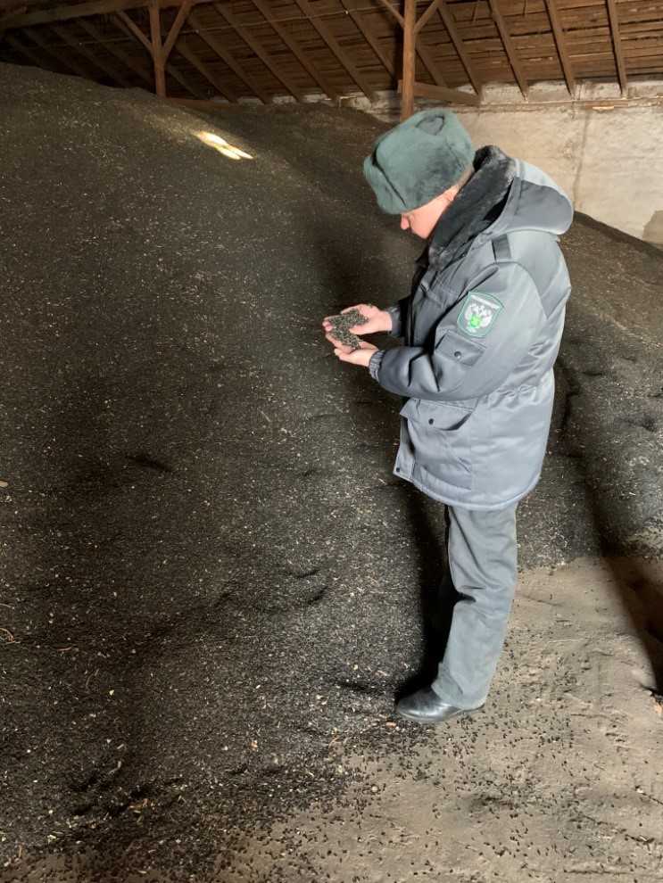 Установлено, что зерносклады, хранящие подсолнечник (общей массой 5 318 тонн), не соответствуют требованиям статьи «О безопасности зерна», а именно: обнаружено проникновение атмосферных осадков в виде снега, через неплотно закрывающиеся полотна дверей образующих большую щель в нижней части ворот. Пол в многочисленных ямах, выбоинах и щелях, что отягчает доступ при очистке складского помещения. Часть лампы освещения в верхней и нижней галерее без защитных колпаков, а также присутствуют живые особи птиц.