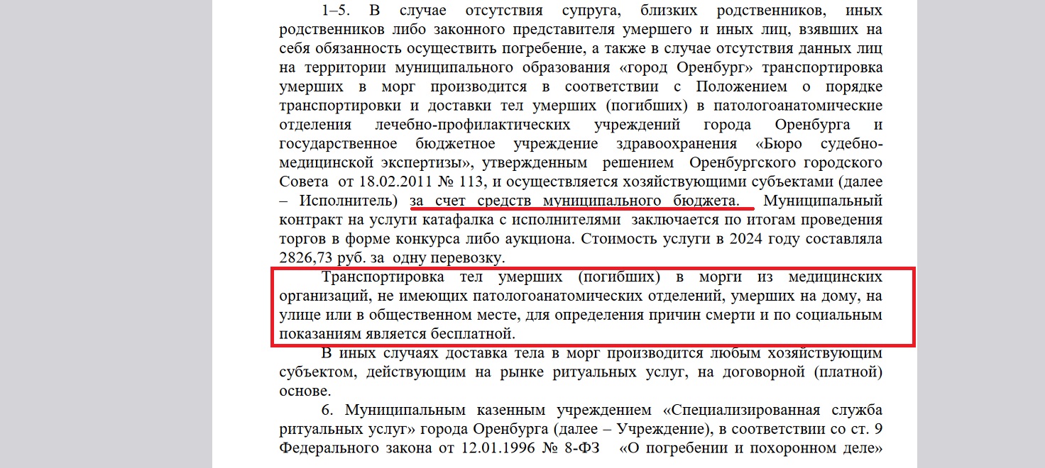 «В случае отсутствия супруга, близких родственников, иных родственников либо законного представителя умершего и иных лиц, взявших на себя обязанность осуществить погребение, а также в случае отсутствия данных лиц на территории муниципального образования, транспортировка умерших в морг производится в соответствии с Положением о порядке транспортировки и доставки тел умерших (погибших) в патологоанатомические отделения лечебно-профилактических учреждений города Оренбурга и государственное бюджетное учреждение здравоохранения «Бюро судебно-медицинской экспертизы», за счет средств муниципального бюджета. Муниципальный контракт на услуги катафалка с исполнителями заключается по итогам проведения торгов в форме конкурса либо аукциона. Стоимость услуги в 2024 году составляла 2826,73 рублей за одну перевозку», – пояснили по данному вопросу в администрации Оренбурга.