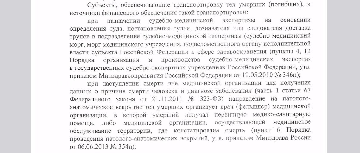 «Субъекты, обеспечивающие транспортировку тел умерших (погибших), и источники финансового обеспечения такой транспортировки», - пишет исполнитель ответа на запрос, но дальше нет никакой информации ни о субъектах, ни об источниках финансирования. Правительство утверждает, что в случаях, когда медицинские мероприятия, осуществляемые в связи со смертью человека, не связаны с необходимостью проведения судебно-медицинской экспертизы или патологоанатомических вскрытий, транспортировка тел организовывается органами местного самоуправления и осуществляться за счёт средств соответствующего муниципального образования (в Оренбурге это МКУ «Специализированная служба ритуальных услуг»). Хотя в других источниках и мэрии Оренбурга поясняют, что как раз-таки, в этом случае услуга выполняется только платно.