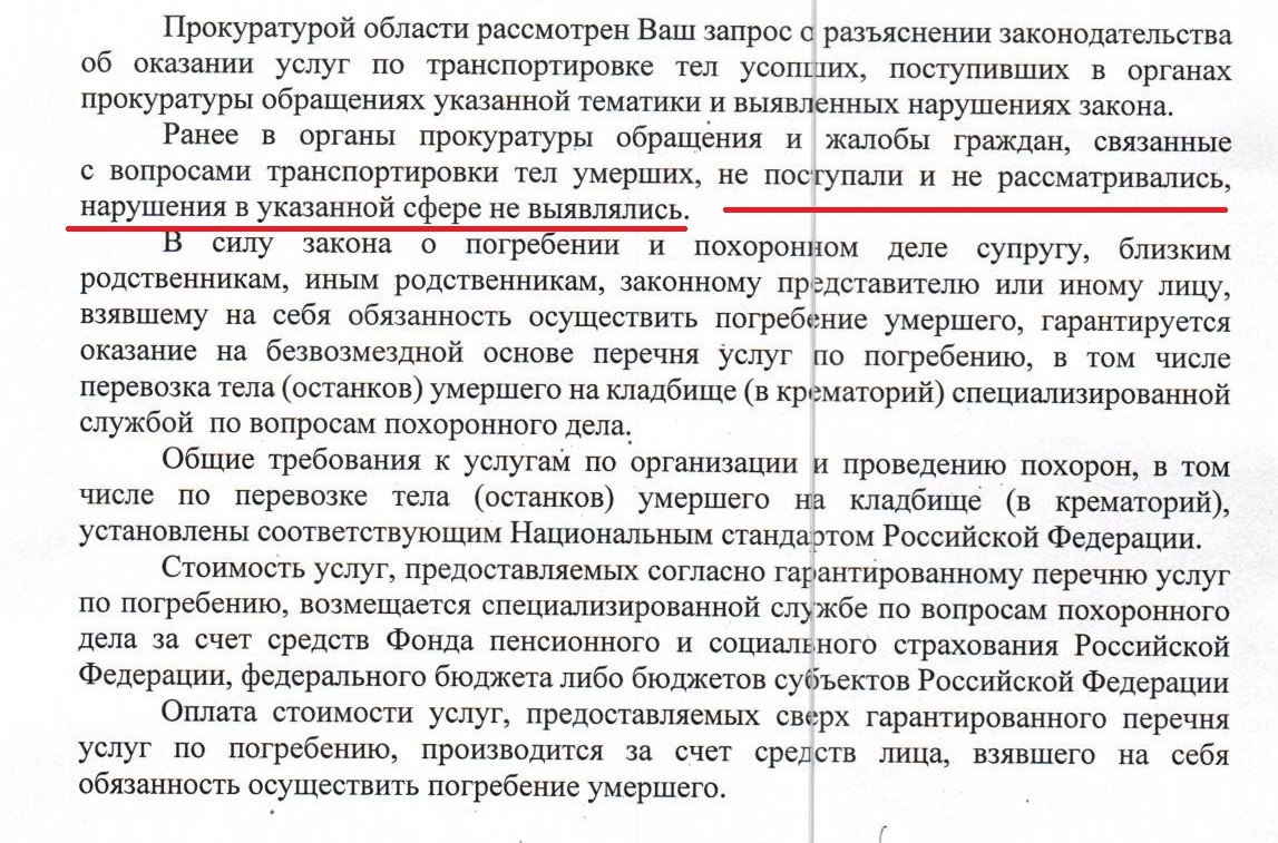 Кстати, в областной прокуратуре заверили, что не получали ни одной жалобы от граждан, связанной с транспортировкой тел умерших, и нарушения в данной сфере не выявлялись.