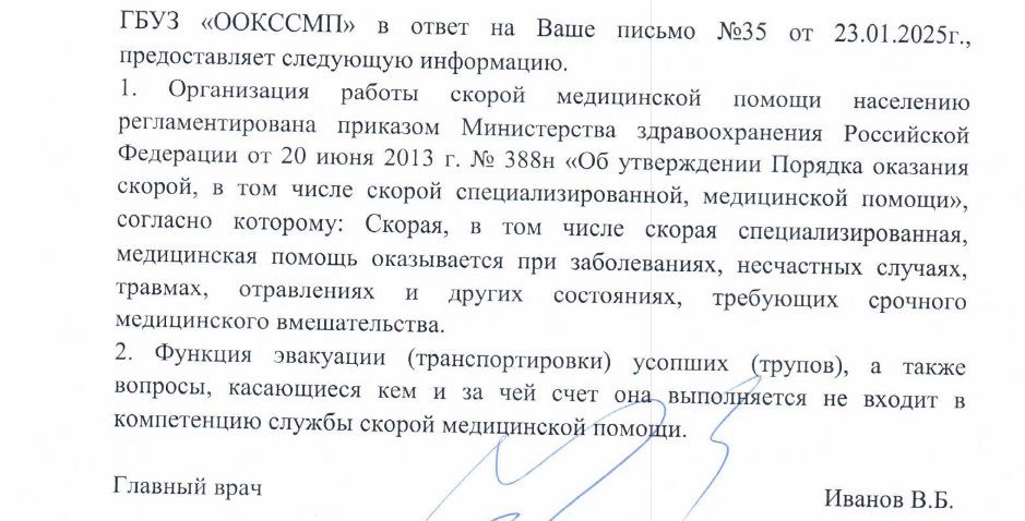 Оренбургская областная клиническая станция скорой медицинской помощи, ожидаемо, открестилась от данного обязательства, так как, действительно, это уже давно не их компетенция.