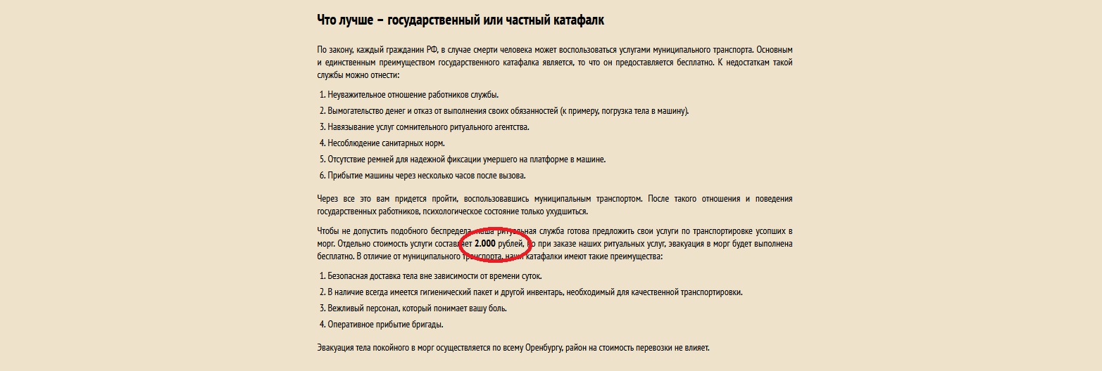В ритуальных агентствах, конечно, будут рады такому звонку, ведь комплекс их услуг широк и разнообразен и обойдётся родственнику усопшего в кругленькую сумму. Как правило, услугу по перевозке покойников многие называют бесплатной, но лишь при условии, если остальные услуги будут заказаны в их организации. Если услуга оказывается отдельно, её стоимость составит от 2 000 рублей. Это в пределах Оренбурга.