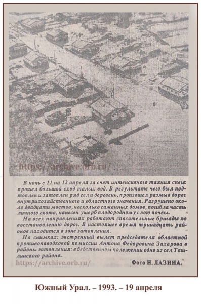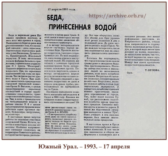 Вышедший из берегов Урал каждый раз напоминает, что он совсем не ручеек, а весенний паводок - дело весьма серьезное. В объединенном госархиве Оренбургской области нашли вырезки из газет, доказывающие, что и весеннее половодье 1993 года тоже наделало немало бед в пойме. Тогда были затоплены тысячи садов и дачных строений, в воде оказалась и часть жилых домов. Читатели газеты «Южный Урал» обращались в редакцию, пытаясь разобраться в причинах разрушительного паводка 31-летней давности, хотя уровень воды тогда едва превысил 8 метров. Тогда из-за прорыва плотины в верховьях Елшанки тоже значительно затопило Старый город в Орске, останавливалась работа общественного транспорта, отменялись занятия в школах. Время идет, а ничего не меняется.