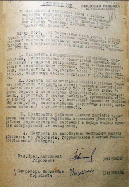 Горисполком тогда решил запретить госучреждениям, предприятиям и отдельным гражданам застраивать и восстанавливать в указанных территориях строения и обязать исполкомы районных советов депутатов трудящихся в соответствии с постановлением СНК РСФСР от 22 мая 1940 года "О мерах борьбы с самовольным строительством в городах, рабочих, курортных и дачных поселках" организовать охрану земель от самовольной застройки и восстановления разрушенных зданий, привлекая виновных к ответственности.