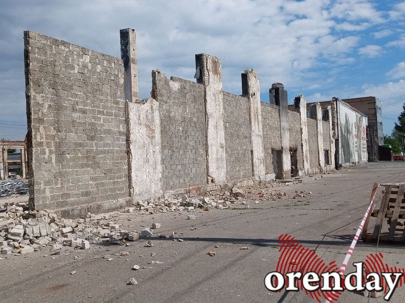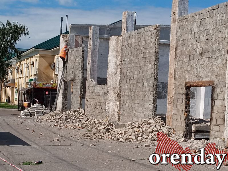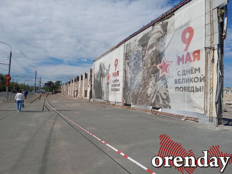 Поврежденный фасад спрятали за огромным баннером. В прошлом году было принято решение, что здесь появится новый жилой комплекс, поэтому, завалы в 2022 году начали разбирать. Корреспонденты Orenday показывали, что находится за "ширмой" - стены, кирпичи, проржавевшие металлические листы, арматура и бетонные плиты.