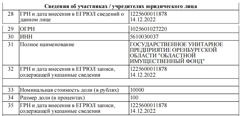 С 14 декабря 2022 года учредитель у ООО был один-единственный - ГУП Оренбургской области «Областной имущественный фонд». Ему принадлежало 100% доли в уставном капитале стоимостью 10 000 рублей.