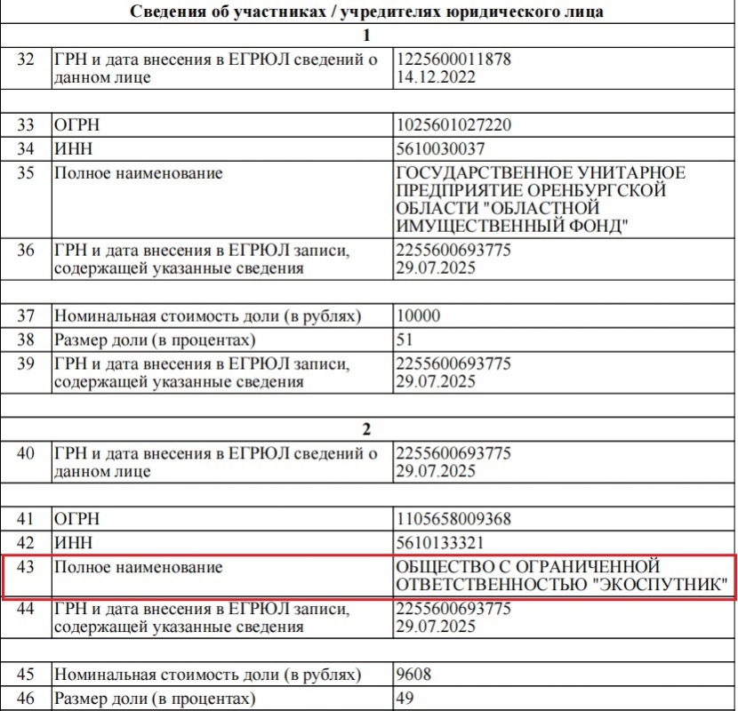 29 июля 2025 года стоимость уставного капитала повысилась до 19 608 рублей. Однако это не единственные изменения. Размер доли областного имущественного фонда резко сократился до 51%. Куда же подевались 49%?! Не переживайте, то есть, переживайте - они отошли ООО «Экоспутник».