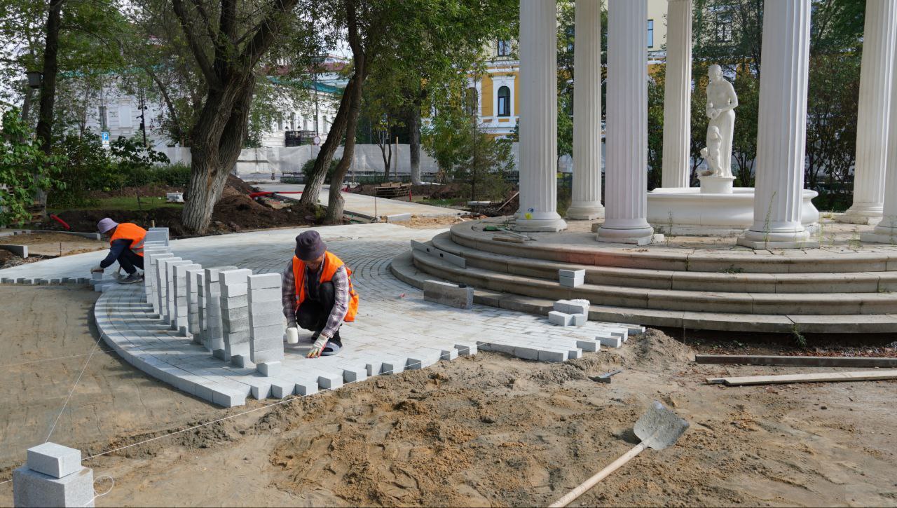 Здесь снято старое бетонное покрытие, подготовлены подстилающие слои, уложено бетонное основание с армированием. Сейчас бригады монтируют гранитную плитку на пешеходных дорожках.
